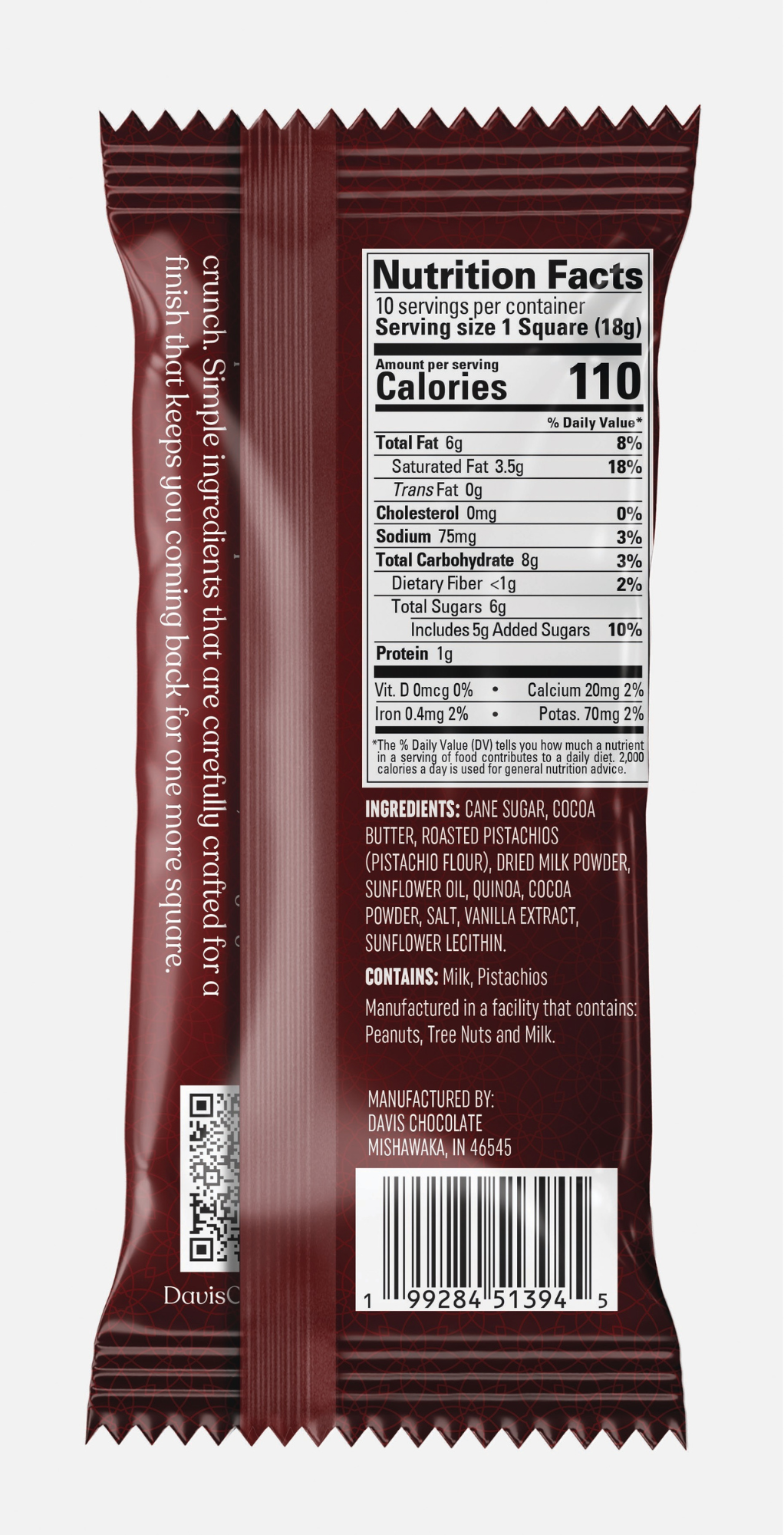 From our family to yours: Thank you for choosing Davis Chocolate. Handcrafted, Certified Kosher, and gluten- and soy-free. This bar marries velvety chocolate with roasted pistachio and quinoa for a delicate, satisfying crunch. Simple ingredients, carefully crafted, for a finish that keeps you coming back for one more square.