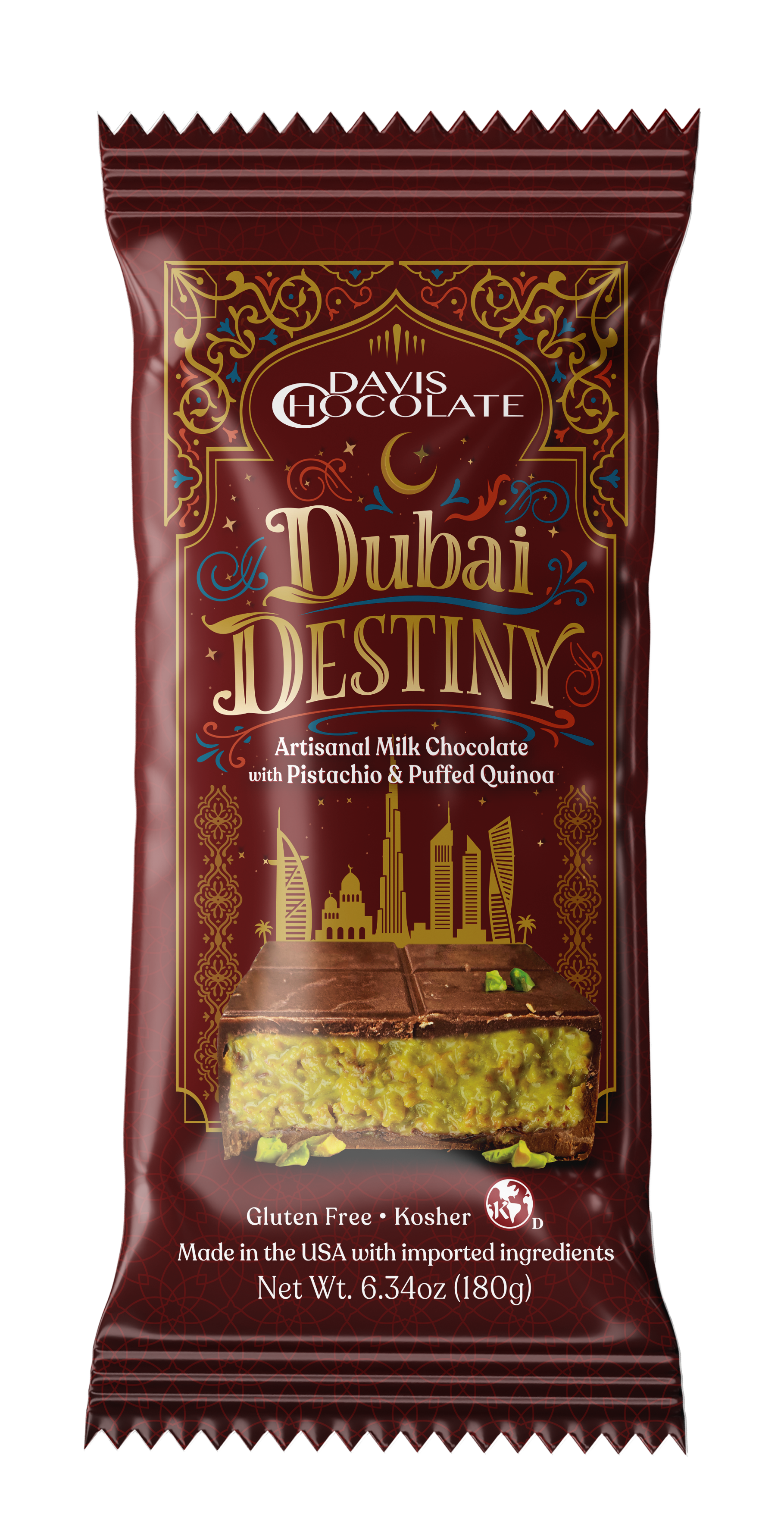 Gluten Free Artisanal Milk Chocolate Dubai Destiny with Pistachio & Puffed Quinoa
