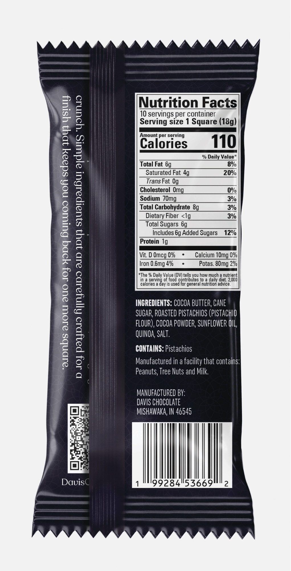 From our family to yours: Thank you for choosing Davis Chocolate. Handcrafted, Vegan, Certified Kosher, made without gluten or soy. This bar marries velvety chocolate with roasted pistachio and quinoa for a delicate, satisfying crunch. Simple ingredients, carefully crafted, for a finish that keeps you coming back for one more square.